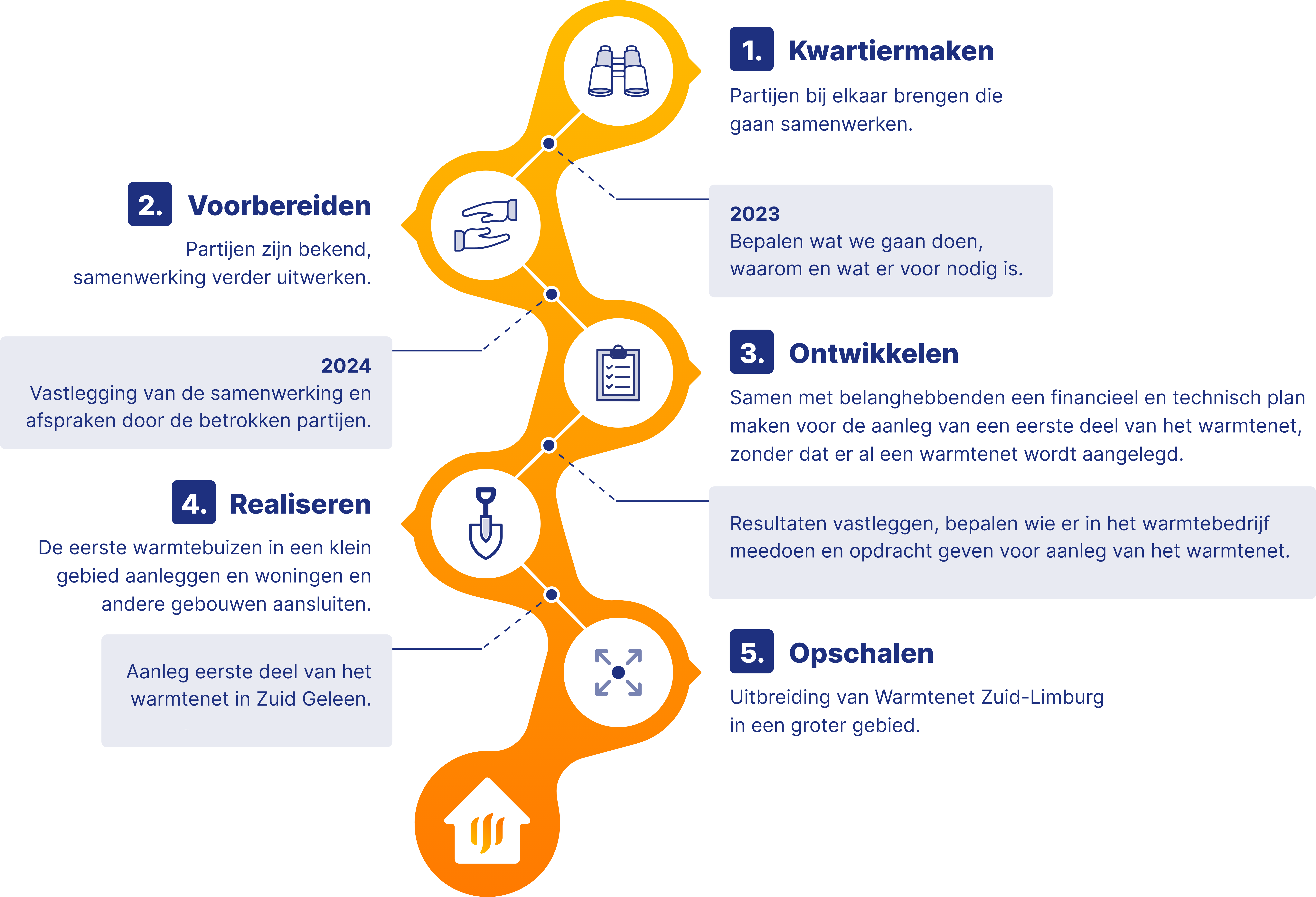 De ontwikkeling van Warmtenet Zuid-Limburg gebeurt in verschillende fases. Onderstaande figuur geeft aan wanneer welke fase plaatsvindt. Op dit moment bevindt Warmtenet Zuid-Limburg zich in de Ontwikkelfase (Fase 3).